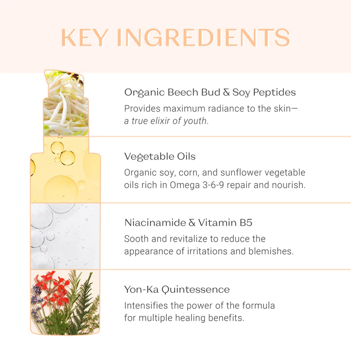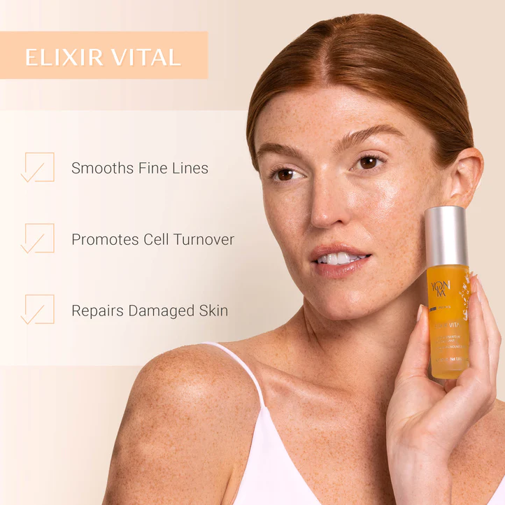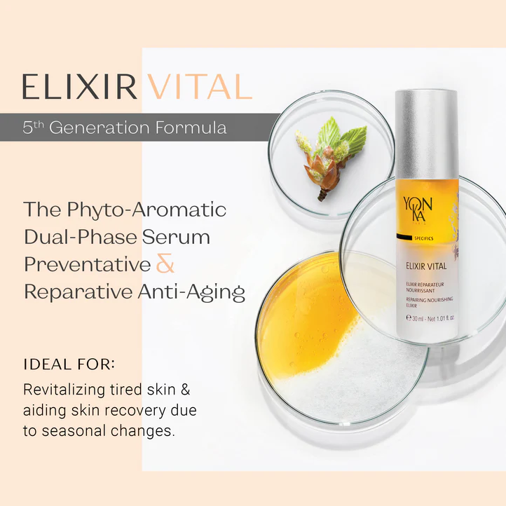 In the morning and/or evening, after cleansing and spraying on Lotion Yon-Ka, shake Elixir Vital well and apply to the face and neck alone or along with your usual Yon-Ka cream. Please note that it is normal for the product to separate. Shaking the bottle blends the powers of its hydric and lipidic phases to truly transform the skin.